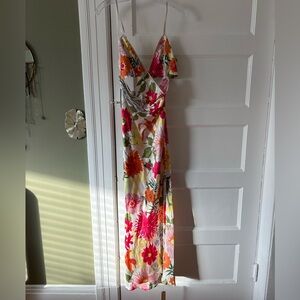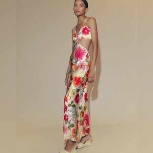 The Poppies is a sleeveless, maxi dress with a deep v-neckline and side cut-outs. It features an open back for an extra flattering fit.