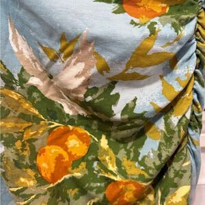 The Prunella Knit Dress from Reformation is a sleeveless mini dress with a straight neckline. It features ruched details on both sides of the dress.