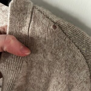 Labeled size medium but has shrunk in the wash (ladies don't let your man wash your cashmere). Would fit size XS-S best. Small hole on left shoulder
