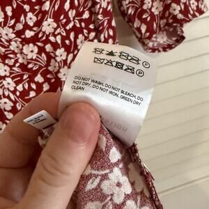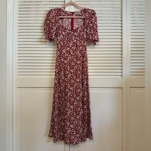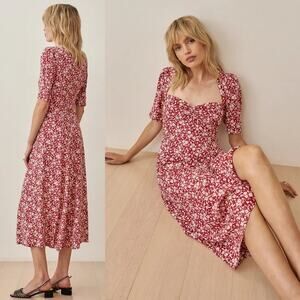 Reformation midi dress perfect for any season. This stunning dress features a rich red fabric with a delicate floral print throughout. The sweetheart neckline and puffed short sleeves add a romantic, feminine touch. The fitted bodice and smocking on the back ensure a flattering and comfortable fit, while the flowing A-line skirt provides graceful movement. It's a versatile piece that can be dressed up with heels for a wedding or dressed down with sneakers for a casual day out.