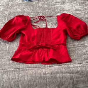 Chic red blouse with puff sleeves. Square neckline and tie back detail. Perfect for stylish outings.