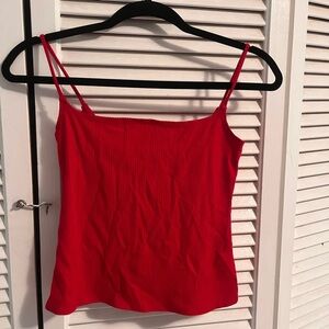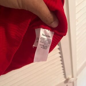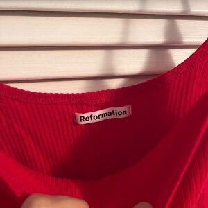 This striking red camisole by Reformation boasts a sleek, fitted silhouette with a sleeveless design. Crafted from a subtly textured fabric, it offers both comfort and style. Perfect for layering or wearing solo, this top is a versatile wardrobe staple.