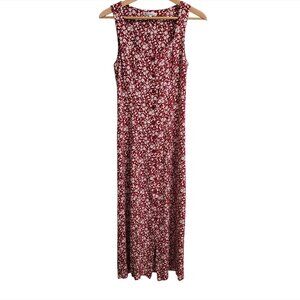 This Reformation sundress features a romantic floral print in red and white, perfect for a wedding guest or a night out. The sleeveless design with a scoop neckline and a flared skirt offers a flattering silhouette, ideal for warm weather.