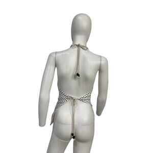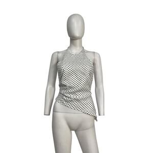 Reformation 'Reese' White Linen Top Size 2: lightweight, non-stretch weave, pleats at side, polka-dot print, asymmetrical hem, halter neckline, sleeveless, ties at back, lined.