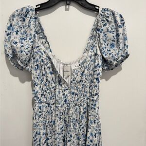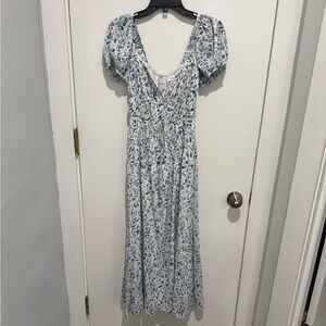 This elegant sundress by Reformation features a charming blue and white color palette, perfect for a wedding guest or resort wear. The dress showcases a pleated and smocked design with a scoop neckline and short puff sleeves, offering a stylish and comfortable fit. Its midi length and airy fabric make it ideal for warm weather occasions.