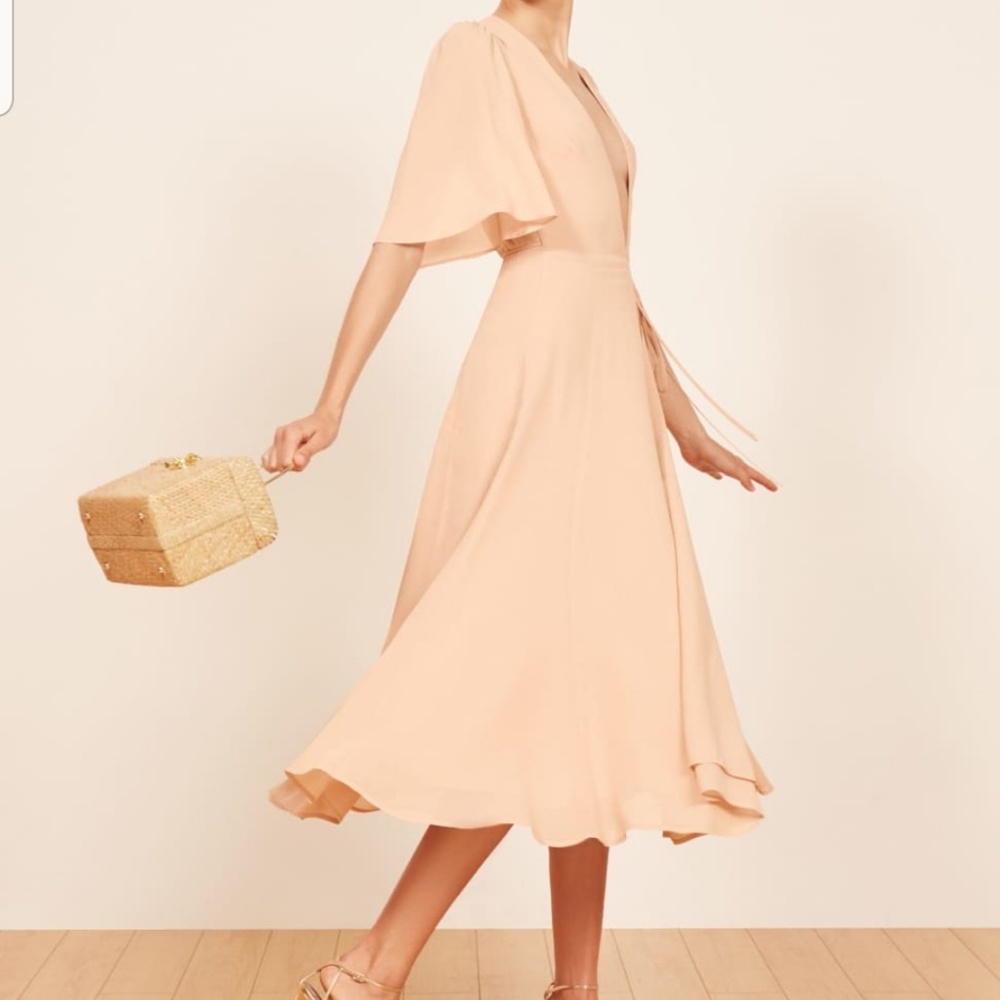 Wrap dress with deep V neckline. Blush pink. Chiffon, fully lined. Never been worn, still in the garment bag.