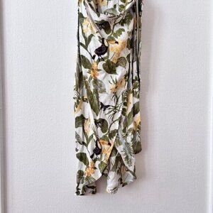 This sleeveless sundress by Reformation features a cream base adorned with vibrant green and yellow floral patterns. The asymmetrical design includes a high slit, spaghetti straps, and a sweetheart neckline, making it perfect for cocktail events or resort wear.