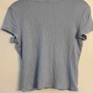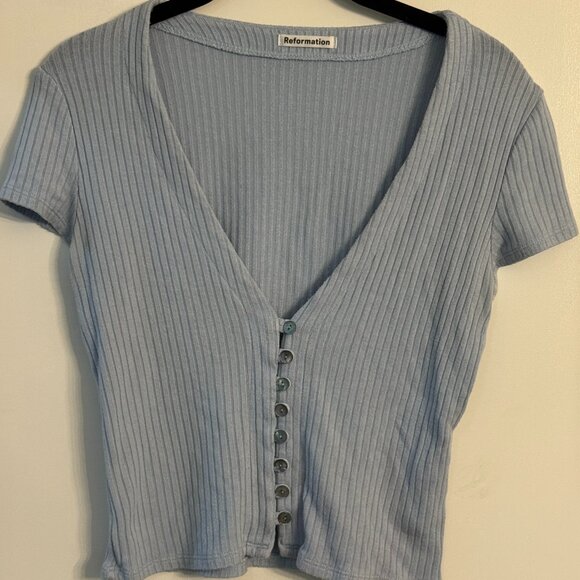 Super cute and versatile Reformation ribbed knit crop top in a soft light blue. Features a flattering deep v-neckline, short sleeves, and button-down front. The stretchy ribbed fabric makes it comfy and easy to style with high-waisted jeans, skirts, or shorts.