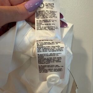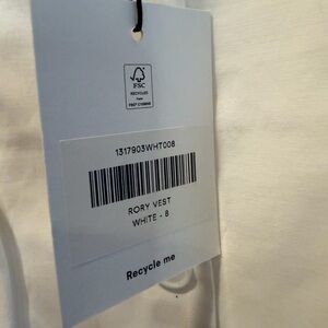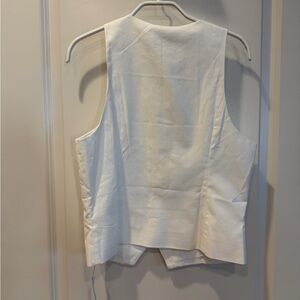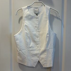 Crisp white sleeveless vest with front button closure. Tailored seams for a slimming silhouette. Clean, versatile piece for layering.