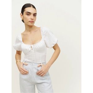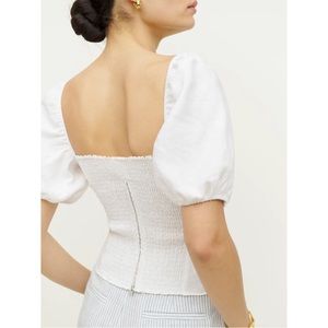 brand: Reformation | style: Rory | material: linen | size: 8 | color: white | “The Rory is a fitted top with a straight neckline and front tie detail. It features a smocked back bodice and loose fitting, puffed sleeves for a slightly dramatic look.” |