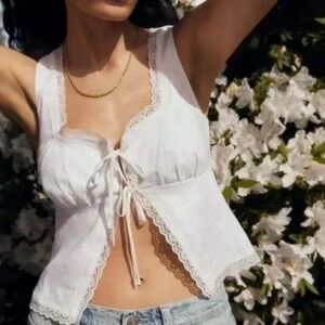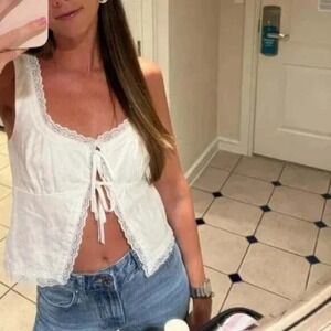 Keywords: lightweight, lined, lace trim, cropped, adjustable ties, bust detail, summer style, vacation top, brunch outfit, date night, patio drinks, beachwear, Europe trip, coastal, picnic, quiet luxury, trending, sustainable fashion, feminine, modern, capsule wardrobe, new with tags, pristine condition.