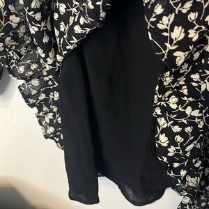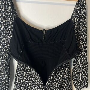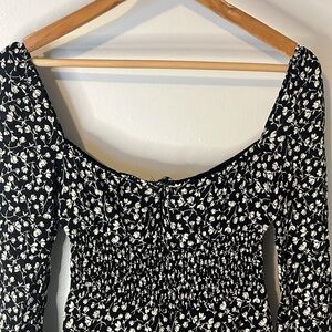 Chic mini dress with floral pattern. Square neckline. Long sleeves. Perfect for any occasion.