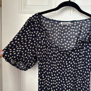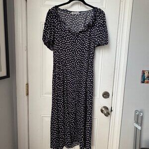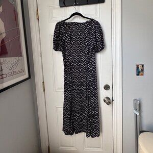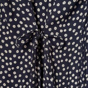 Pretty, flirty, and light, this dress is so flattering and adjusts to your body from a back tie. Flutter sleeves and a ruffle around the neck, great movement in the skirt. I can't overstate the amount of compliments i get in this dress, but it no longer fits me.