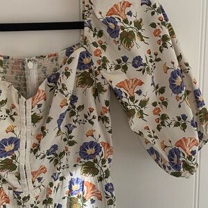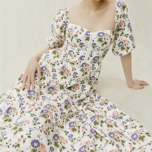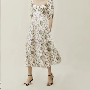 Gorgeous Reformation midi dress with a flattering corset like top. Fits like a usual size 4 of the brand. Some slight smudging on the bust due to white being so difficult to keep clean but It’s lightly worn and just dry cleaned.