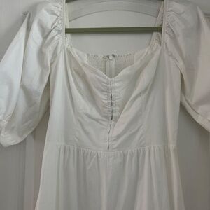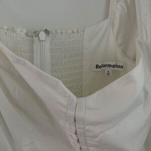 Rutherford Dress from Reformation, a midi length dress featuring puffed sleeves, corset style bust, and a relaxed skirt. I love this dress but it doesn’t fit me anymore. Worn once and is in like new condition.