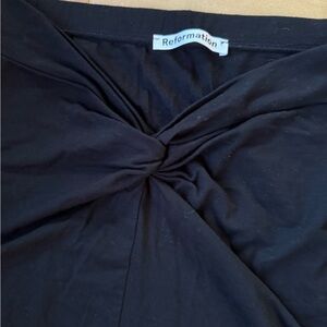 This stunning black two-piece skirt set from Reformation features a chic gathered front design, perfect for casual or resort wear. This stylish set also includes a cropped tank. With its elegant length and comfortable fit, this skirt is ideal for relaxed outings or beachside strolls.