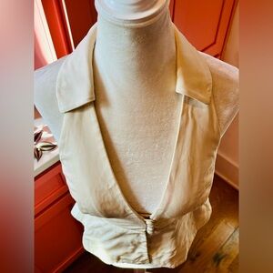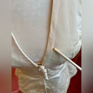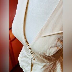 The Reformation Off-White Rylan Top is a chic and sophisticated piece featuring a v-neckline and a fitted, feminine silhouette. The off-white hue adds a timeless elegance, while the subtly structured design make it versatile for both casual and formal occasions.