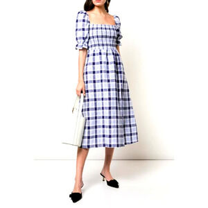 Reformation Marabella Linen Midi Dress Puff Sleeve Gingham Checkered Blue