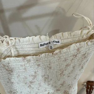 This is a midi length dress with a straight neckline, smocked bodice, and spaghetti tie straps. The Sable is slim fitting in the bodice with a relaxed fitting skirt.
