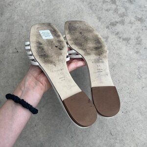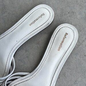 Reformation white leather strappy sandals. Flat slip on sandals, perfect for summer. Purchased from TheRealReal, worn once. Please inspect pics for wear. No major flaws noted, some wear at the toe areas. Leather material is still in good condition