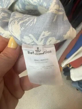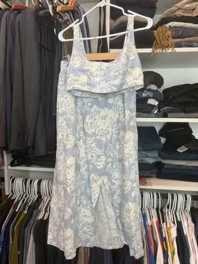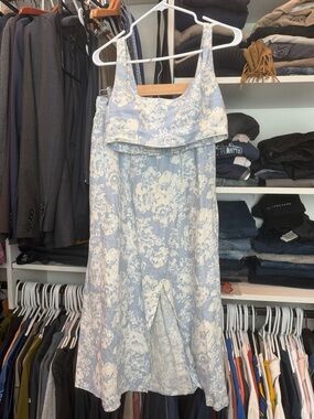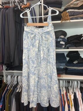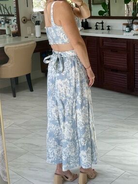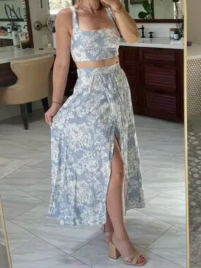 Light blue and white linen floral maxi skirt and matching zip-back top from Reformation. Features a high side slit for movement. Flowy fabric creates soft drape. Elastic waistband for easy wear, tie in the front or back.
