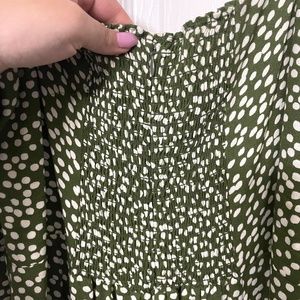 Center back zipper, elastic at cuff, elastic at shoulders, high slit, slightly puffed shoulders, slim fitting bodice, square neckline, strapless bra friendly, and unlined.