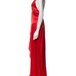 This is a 100% silk open back dress with a plunging neckline, high ruffled slit, and adjustable cross-back straps. Color is Fruit Punch (a slightly orange red). Sold out. NEW WITH TAGS!!