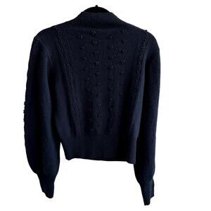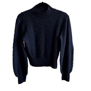 Reformation Sinclair Cable Knit Wool Sweater in Navy Blue. Size small. Features textured chunky cable knit fabric with embroidered detail, mock neck, long blouson sleeves, ribbed collar, cuffs and hem, pullover style, semi cropped, relaxed fit. 100% wool. Great used condition, no notable flaws. Tags: cozy, warm ey, preppy, casual, fall, dark, modest, turtleneck, embroidery, feminine Chest: 19" Length: 21" (approx.)