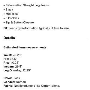 These Reformation Size 24 Black Mid-rise Straight Leg Denim Jeans are a stylish and versatile addition to any woman's wardrobe. Made from dark wash denim with a solid black color, they feature a mid-rise and straight leg fit for a flattering silhouette. The jeans are designed with a zip and button closure, and are crafted for a regular size fit. Perfect for everyday wear or dressed up for a night on the town, these Reformation jeans offer a timeless and classic style that is both comfortable and on-trend. Pre-owned