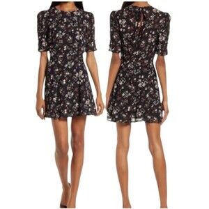 REFORMATION Gracie floral short sleeve mini dress black with pink roses $288