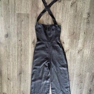 Chic black jumpsuit with a fitted bodice. Wide-leg design for a modern look. Perfect for stylish outings.