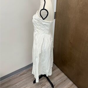 Chic strapless dress by Reformation. Features a ruched bodice and flowing skirt. Ideal for elegant occasions.