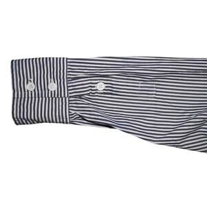 Minimalist and modern, this Reformation shirt features navy and white vertical stripes, a classic collar, and full button closure. Made from 100% cotton deadstock fabric. Sustainable and timeless, this piece transitions seamlessly from office to weekend wear.