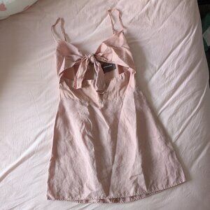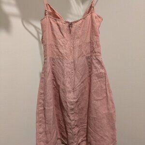 Pink 100% linen mini dress from Reformation with a cute self-tie detail that can be untied and retied to your preference. The torso/tie pieces and skirt are slightly different colors from being in the sun but it's not super noticeable--see the last 3 pictures for comparisons.