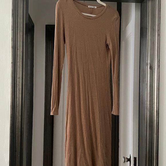 This elegant tan ribbed dress offers a sleek and comfortable fit, perfect for any occasion. Its long sleeves and classic design make it a versatile addition to your wardrobe.