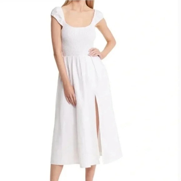 Reformation Tavi 100% Linen White Smocked Ruffle Midi Dress Size Large NWOT