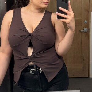 Reformation Tefi knit tank in the color "mole". Fabric is cotton cinch, described by Reformation as "a lighter weight stretch fabric with a soft handfeel made with 88% organic cotton, 12% spandex."