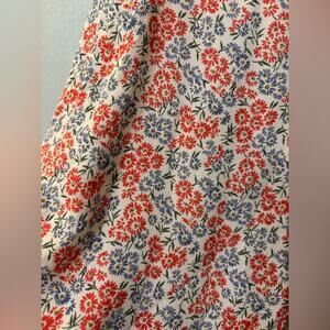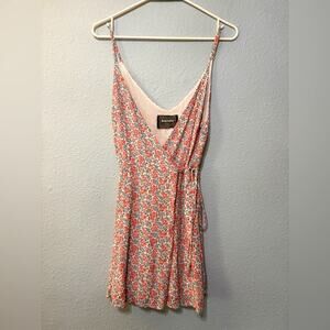 Excellent condition. Size small. Wrap mini dress with deep v neckline. Lined. Adjustable tie. Cute petite floral print in red and blue with green leaves on white.