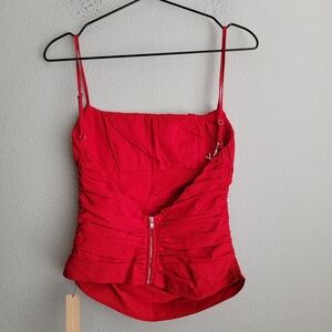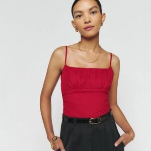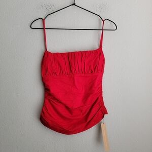 A fitted, sleeveless top with a straight neckline, adjustable straps, and ruched details.