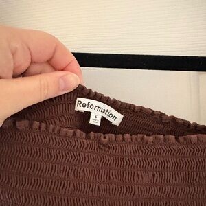 Long sleeve Reformation top. Size small. Espresso/ chocolate brown color. Super cute and classic Ref top! Can be worn on or off shoulder. Flattering.