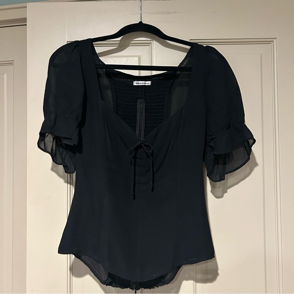 Chic black blouse with ruffled sleeves. Features a tie-front detail. Gently worn.