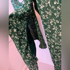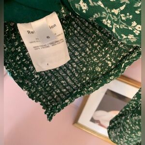 Green Reformation cropped blouse with white floral print. Cute square neckline. Has zipper on sides. I love this top but it is too small for me. Runs small in my opinion.