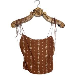 Reformation Top Crop Tank Square Neck Cami Tie Strap Brown Floral Ruched Side 0