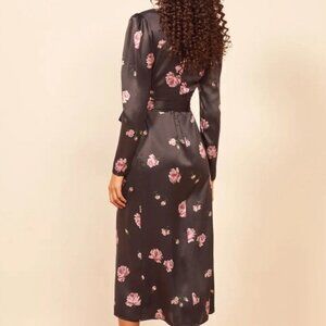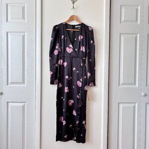 This is a deep v-neck, ankle length dress with overlapping front detail and a detachable belt (NOT INCLUDED). The Toronto is relaxed throughout with a high slit. Zipper. Deep v neckline. High slit. Midi length. Overlapping front. Slightly puffed shoulders. Unlined. Lightweight silk charmeuse fabric