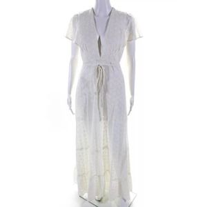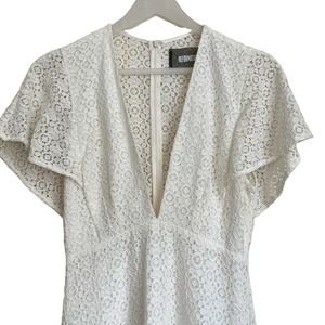 Flutter sleeves and a deep plunge in the front. Such a gorgeous and rare gown! Has mini length slip lining inside.