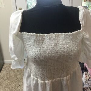 New without tags, never worn. Comes from a smoke-free home Size 1X. Smocked elasticized top. Front slit. Off-the shoulder puffed sleeves. 100% Linen. Machine washable.