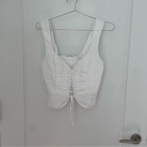 This chic white tank top from Reformation features a stylish corset front and a fitted silhouette, perfect for a sleek summer look. The crisp white color and tank top style make it a versatile addition to any wardrobe, ideal for both casual outings and more polished occasions.