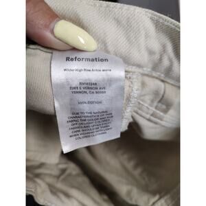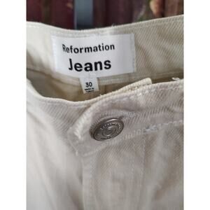 The Reformation Wilder Denim High Rise Ankle Jeans in size 30 are a stylish and versatile addition to any woman's wardrobe. Made from light wash denim with a solid blue color, these jeans feature a zip and button closure, along with a regular fit and ankle length. The design accents include a zipper, button, and pockets, adding practicality to the chic silhouette. These jeans by Reformation are perfect for everyday wear or can be dressed up for a night out, making them a must-have for any fashion-forward individual.