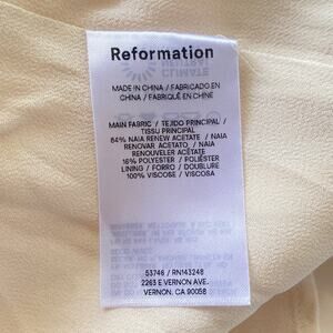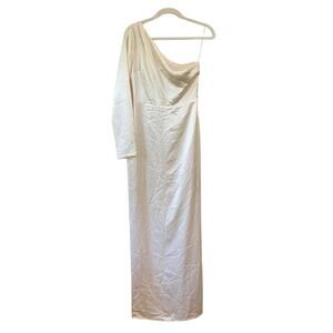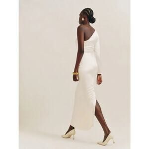 Reformation Winifred Satin Dress in Fior Di Latte. Size 2. Features one shoulder styling, a long sleeve, lined, asymmetrical neckline, back slit, zip with hook and eye closure, long maxi length. Fabric 84% NAIA renew acetate, 16% polyester. Style 1314713FDL. Brand new, NWT / New with tags.
