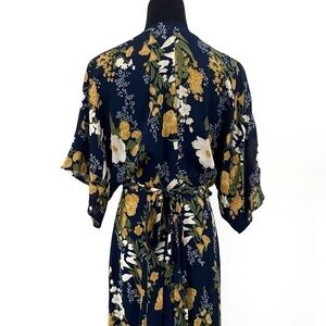 This is a v-neck, wrap dress with oversized sleeves and a relaxed fit throughout.